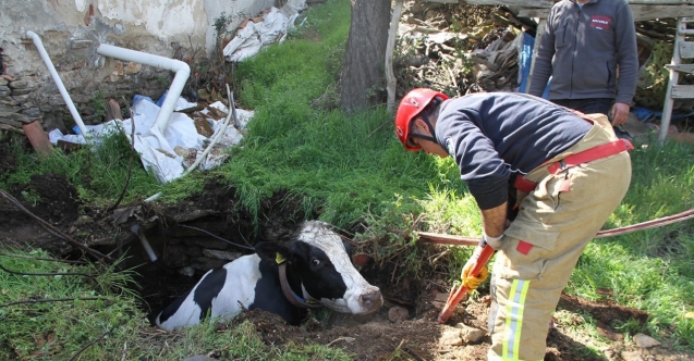 Kuyuya düşen 7 aylık gebe inek kurtarıldı