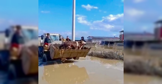 Selde mahsur kalan inekler boğulmaktan kurtarıldı