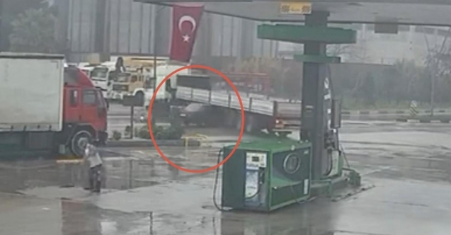 Öte yandan, kaza anı akaryakıt istasyonunun güvenlik kameraları tarafından anbean kaydedildi. Görüntülerde tırın manevra yaptığı sırada otomobilin duramayarak dorsenin altına girdiği görülüyor.