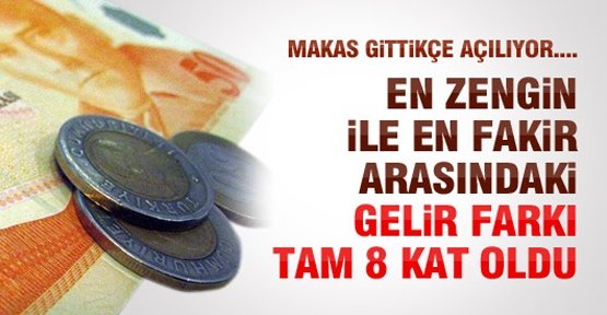 Türkiye İstatistik Kurumu (TÜİK), 2011'de Türkiye'de, en yoksul yüzde 20 ile en zengin yüzde 20 arasında 8 kat gelir farkı olduğunu açıkladı. TÜİK, Gelir ve Yaşam Koşulları Araştırması 2011 verilerini yayımladı. TÜİK araştırmasına göre, geçen yıl en yoksul yüzde 20 ile en zengin yüzde 20 arasındaki gelir farkı 8 kat çıktı.