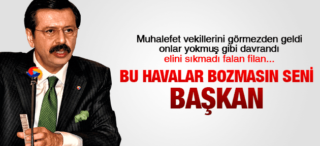 Törene giriş yaptığınızdan itibaren muhalefet milletvekillerini görmezden gelmeniz ve MHP ve CHP milletvekilleri olarak bizleri selamlamadan yerinize geçmeniz bizi şaşırttı. Ardından konuşmanızda hiç gereği yokken abartılı bir uslup ve içerikle hükümet politikalarını bir Svivil Toplum Kuruluşu Başkanı olma sıfatından çok farklı bir yaklaşımla abartılı bir şekilde övdünüz. Ayrıca, Manisa Sanayi ve Ticaret Odası Başkanı Bülent Koşmaz’ın kendi isteği ile BALO Yönetim Kurulu Başkanlığı yapmak için TOBB’dan müsade istediğini ifade ettiniz.