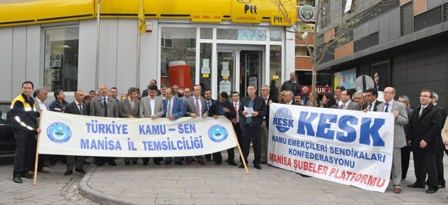PTT Manisa Merkez Şubesi girişinde düzenlenen eyleme, MHP Merkez İlçe Başkanı Engin Kabadağ, KAMU-SEN Manisa İl Temsilcisi Mustafa Genç ve KAMU-SEN Manisa İl Temsilliğine Bağlı Şube Başkanları, KESK’e bağlı sendikaların şube başkanları katılarak destek verdi. Düzenlenen eyleme dört büyük konfederasyonun haberleşme işkolunda faaliyet gösteren görevli sendikalardan KESK’e bağlı Haber-Sen, BASK’a bağlı Bağımsız Haber-Sen, Kamu-Sen’e bağlı Türk Haber-Sen ve Memur-Sen’e bağlı Birlik Haber-Sen’in katılımı beklenirken, eyleme katılacağına dair protokole imza atmasına rağmen Memur-Sen’e bağlı Birlik Haber-Sen’in katılmayışı dikkatlerden kaçmadı. PTT Manisa Merkez Şubesi önünde toplanan grup adına açıklama yapan Kamu-Sen’e bağlı Türk Haber-Sen Şube Başkanı Halil İbrahim Duman, “Hükümet, bu yasa tasarısıyla, PTT’nin düşük ücretlerle verdiği kamu hizmetini pahalı hale getirmeyi; çalışanları esnek, kuralsız ve iş güvencesiz istihdam etmeyi amaçlamaktadır. PTT’nin sunduğu kamu hizmetini sermayenin kâr hırsına teslim etmeyi, PTT emekçilerini ise köleleştirmeyi planlamaktadır. Yasal güvencelerini ortadan kaldırıp, tüm özlük haklarını yönetim kurulunun keyfi kararlarına bırakmaktadır. Emekliliğe hak kazanmış olan arkadaşlarımızı, bir yıl daha çalışmaları halinde alacakları ücret karşılığındaki “yüzdelik teşvikler” ile aldatıp çalışma hayatından koparmayı, PTT’yi para babaları için “dikensiz gül bahçesi” haline getirmeyi, hemen ardından da parça parça satmayı hedeflemektedir. Oysa PTT, Posta Dağıtım Hizmetleri, Banka İşlemleri ve Lojistik (Kargo) işlemleri ile en önemli kamu hizmetlerinden birini yerine getirmektedir ve bu yasa tasarısında “kamu yararı” bulunmamaktadır. Nitekim 1 Şubat 2013 tarihinde kayıtlı posta ve kargonun taşeron şirkete devredilmesiyle, 1,5 aylık süre içinde PTT’nin % 40’lık iş hacmi ve kamuoyu nezdindeki güveni kaybedilmiştir” dedi. Manisa’dan hükümete seslenen Duman, “Öncelikle bu yasa tasarısının derhal geri çekilmesi ve kurumumuzun halka daha iyi hizmet verebilmesi için; acilen kadrolu personel eksiğinin giderilmesi, dağıtıcıların yıpranma hakkının geri verilmesi ve 55 yaşında res’en emekliliğe son verilmesi, yüksek gelir vergisi dilimlerimizin 657 sayılı kanuna uygun hale getirilmesi ve ücretlerimizin insanca yaşanacak düzeye yükseltilmesi gerekmektedir” şeklinde konuştu. Konuşmaların ardından Kamu-Sen’e bağlı Türk Haber-Sen Şube Başkanı Halil İbrahim Duman ve beraberindekiler, PTT çalışanların sorunlarının yazılı olduğu dosyaları kargo ile gönderdikten sonra aynı raporları sunmak için CHP ve MHP İl başkanlıklarını ziyaret ettiler.