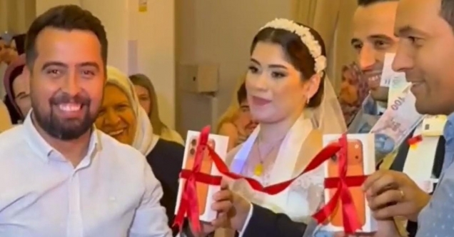 Manisa’nın Turgutlu ilçesindeki bir düğünde damadın arkadaşları, gelenekselleşmiş altın takısı yerine gelin ve damada son model bir iPhone hediye ederek tüm davetlileri şaşırttı.