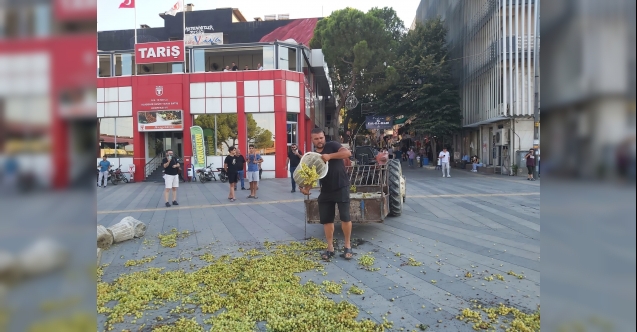 Alaşehir ilçesinde bir üzüm üreticisi, traktörüyle ilçe meydanına getirdiği üzümleri dökerek eylem yapmak istedi.