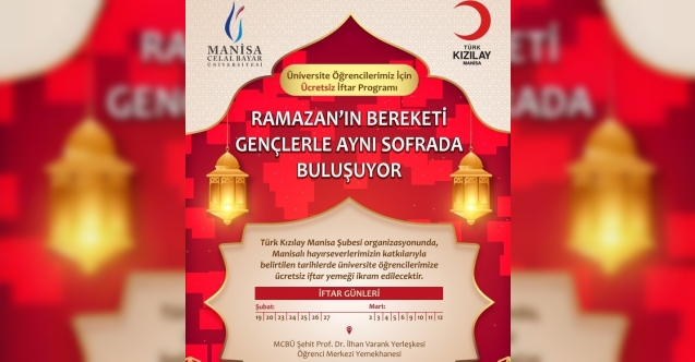 Türk Kızılay Manisa Şubesi tarafından, Manisalı hayırseverlerin katkılarıyla üniversite öğrencilerine yönelik ücretsiz iftar programı düzenleniyor. Ramazan ayının paylaşma ve dayanışma ruhunu yaşatmayı amaçlayan organizasyon kapsamında, belirlenen tarihlerde öğrencilere 16 gün ücretsiz iftar yemeği ikram edilecek.