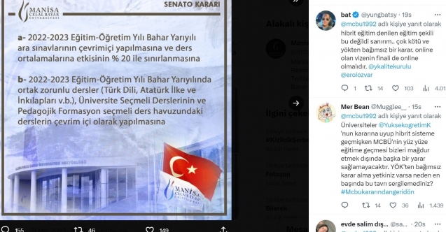 Yükseköğretim Kurulu (YÖK) Başkanlığı tarafından 30 Mart tarihinde 2022-2023 Eğitim Öğretim Yılı Bahar Dönemi’ne ilişkin alınan kararlar sonrası Manisa Celal Bayar Üniversitesi (Manisa CBÜ) Senatosunun aldığı kararlar, öğrenciler tarafından tepkiyle karşılandı.