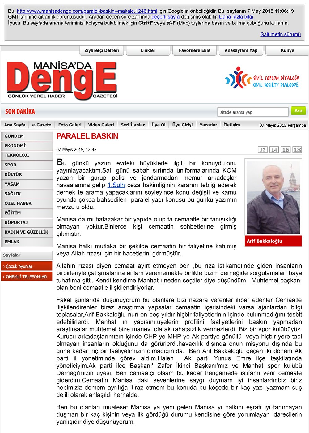 Paralel Yapı operasyonun uzanan ismi Arif Bakkaloğlu ise her hafta düzenli olarak köşe yazısı yazdığı denge gazetesinde AK Parti'yi eleştiren ve Gülen Cemaatine olan sempatisini kaleme aldı.