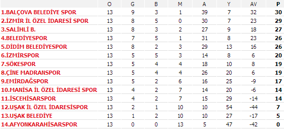 İlk yarısı sona eren Bölgesel Amatör Lig 8. Grup’ta puan tablosunun zirvesinde Balçova Belediyespor yer aldı. Temsilcilerimiz Manisa Belediyespor ile Salihli Belediyespor da liderin ensesinde ligi umutlu kapattılar. Salihli Belediyespor son hafta İzmirspor deplasmanında 2 puan bırakmasına rağmen 27 puanla devreyi kapatırken, Manisaspor Belediyespor da Afyonkarahisarspor’u 10-1 yenerek puanını 26 yaptı. İlk yarıda 14 puan toplayabilen Manisa İl Özel İdarespor ise kümede kalma şansını mucizelere bıraktı. Ligin ikinci sırasında yer alan İzmir İl Özel İdaresi ise oynadığı 13 maçta 8 galibiyet, 5 beraberlik alarak ilk yarı sonu itibariyle grubun tek namağlup takımı oldu. Zor günler geçiren ve geçtiğimiz sezon 3.Lig’den düşen Afyonkarahisarspor oynadığı karşılaşmalarda tek puan dahi alamadı.
